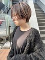 大人かわいい前下りショート、ハンサムショートは小顔補正立体カットでウザバングを作りシャープに切った毛先のライン、襟足をしめスッキリ見せたり、メリハリを効かせ絶妙なバランス!ブリーチ後シアーグレージュでうるツヤ。こなれヘアはミストバングで!