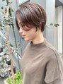 大人かわいいハンサムショートはシャープに切ったライン、襟足をしめてスッキリ見せてくびれのある絶妙なバランスに!カラーはアッシュベージュにし計算されたウザバングを小顔補正立体カットで。うるツヤなクセをいかしたヘアを楽しみませんか?