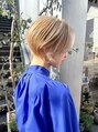 大人かわいい前下りのハンサムショート、大人ショートボブはシャープに切った毛先のライン、襟足をしめスッキリ見せたり、メリハリを効かせ絶妙なバランス!ブリーチ後ミルクティーベージュにし大人見えに! ウェットスタイル楽しみません?