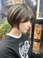 大人かわいい前下がりのショートボブはシャープに切ったライン、襟足をしめてスッキリ見せてコロンとしたシルエットで絶妙なバランスに!ブリーチ後ダークグレージュにし計算されたウザバングを小顔補正立体カットで。うるツヤなこなれヘアを楽しみませんか?