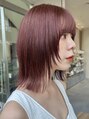 肩につく長さで前下がりにカットし、顔まわりにレイヤーを多めに入れています。#ウルフ#レイヤースタイル#レイヤーカット#暖色カラー#デザインカラー#ボルドーカラー