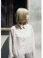 ダメージを抑えつつケアブリーチを2~3回し、淡いグリーンをオンカラー。メイクやファッションに合わせて派手色になりすぎない日常に溶け込むカラーをチョイス。カットはシンプルかつ顔まわりにデザインポイントを入れることで周りと差をつけるスタイルに。