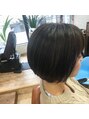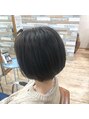 サイドがほんの少し前下がりのショートボブスタイル。シースルーハイライトで艶感、透明感、立体感をプラス。カラーは、ブルー×ラベンダーで青紫に。手ぐしで簡単スタイリング。