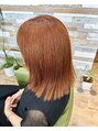 鎖骨レングスのロブ。伸ばしやすく毛先とボリュームのメンテナンスカット。酸性薬剤で前髪の縮毛矯正。新生部はパウダーブリーチ、既ブリーチ部は脱染しながらベースを作り、マグネットとウルティアでwケアしながら、アプリコットをオン
