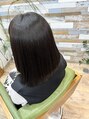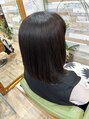 ウルティア縮毛矯正、ポイントカット、シャンプーブロー。クセと髪質に合わせた、酸性薬剤とアルカリ薬剤のハイブリッドミックスで、酸性寄りの弱アルカリ縮毛矯正。広がりを抑えて柔らかツヤツヤに。