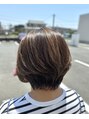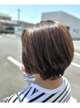 ブラウンベースにハイライトを入れて色落ちしても黄色がでないようにしています。カットは、ショートボブで乾かすだけで形になるように巻いて動きがでるようにしています。