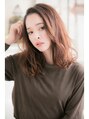 鎖骨ラインのワンレングス表面にレイヤーを入れてことでニュアンスある動きを実現。平巻きでパーマを。カラーはスモーキーピンク。