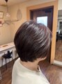 後頭部に自然な丸みを出したショートボブ。トップに動きをつけて、ふんわり感とツヤを両立しています。落ち着いたブラウンカラーで上品さをプラスし、首元はスッキリ見せることで大人女性に似合う若見えシルエットに仕上げました。