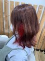 インナーカラーを濃いレッドにして、表面のカラーもレッドブラウンにして全体的に赤系のカラーにしました☆ミディアムの長さにはくびれのある外ハネスタイルがオススメです♪