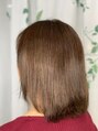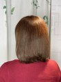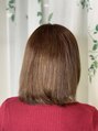 ブリーチを使わないダブルカラーで作るミルクティベージュ。白髪が伸びてきても気にならないように染めていますが、白髪染めは次にどんな色にも移行できるように使っていません。リンゴ幹細胞培養液のトリートメントで極艶を!