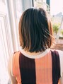 前髪は眉ラインで長さはあご下のパッツンボブです。コンパクトなシルエットになるようカットしています。風になびいた時や耳にかけた時にアクセントになるようイヤリングカラーをしています。幅や色はデザインによって。