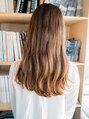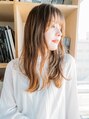 ロングヘアーの巻き髪スタイル。ガーリーなイメージになるように前髪はおろしてシースルーのパッツンにしています。カラーは明るめのブラウンで透け感をだしています。レーヤーは入れずに少し重めに残すことでガーリーなスタイルになります。
