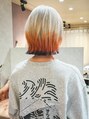 ホワイトブロンドに、オレンジとブラックのデザインカラー。レイヤーをいれて、ぱつっとラインを残しつつも、柔らかいスタイルに。