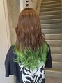 ブリーチ1回~お団子で隠れる裾幅をブリーチ!高発色の緑をオンカラー☆全体は明るいブラウンベースでカジュアルに☆