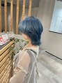 ブリーチ2回~黄色が薄いベースになるようにブリーチ☆青を薄めた色をオンカラー☆耳にかけてメンズライクになるようなウルフにカット☆アイロンのみで簡単スタイリング☆