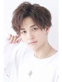 スパイラルパーマの爽やかアップバング。襟足は刈り上げでスッキリとさせ、後頭部に丸みを持たせます。目尻に毛束をシャープに下ろし、顔まわりを締めます。