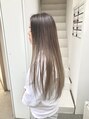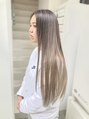 酸性ストレートパーマをかけて、バレイヤージュとウィーヴィングでグラデーションカラーのベースをつくり、ノーブルモーブという色味で白っぽさをつくりました。ハイブリーチですが、髪はサラサラツルツルです。