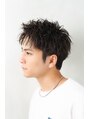 清潔感溢れるアップバングスタイル。前髪眉上で切り、サイドも耳出るくらいでカット。襟足は刈らずにハサミで整える。緩めのワンカールでパーマをかけ、時短セット実現!!