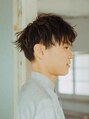 耳周り、バックをすっきりと短くしたさわやかなツーブロックのアップバングスタイルです。前髪は、黒目の上からしっかりとあげることでバランスの良いスタイルに。全体の毛先は無造作に動かして毛束感をプラスしています。