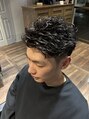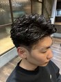 ブルーブラックの髪色に、清潔感あるテーパーフェードを組み合わせ、動きと立体感を出すアイロンパーマを施したスタイリッシュなメンズヘア。