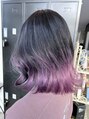 ブリーチ2回から3回しているベースの毛に根元からダークグレー、毛先ピンクバイオレットを入れたグラデーションカラーです。