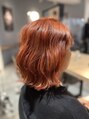 シンプルな肩上の切りっぱなしのボブスタイルです。ヘアスタイルのアクセントとしてビビットなカラーリングをしました。全体をブリーチ後オレンジのカラーをして可愛らしく仕上げました。少ない回数のブリーチでもチャレンジしやすいカラーです。