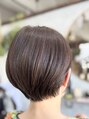 えりあしの生えグセ、骨格や元々の毛量に合わせて、アイロンなしでスタイリングできるショートに♪カラーも白髪を無視して明るめのシナモンベージュにすることで、白髪染めでは出せない自然な立体感と柔らかさを♪