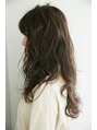 旬のグレージュカラーに緩めのカールをONして可愛さアップ☆重たくなりがちなロングもグレージュカラーで透け感がでて軽い質感に☆厚めフルバングで小 顔効果☆無造作にスタイリングすることでくせ毛感を演出しています!