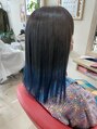 毛先に入れたブリーチは色落ちも楽しめる濃い青で!耳上から下半分はスッキリ刈り上げているので結んで髪を上げるとかっこよく仕上がります!