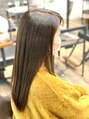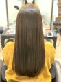 コスメストレートで柔らかくクセを伸ばしたロングヘアにオレンジの色素を軽減させるようにカラーリング。