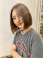 スリークなアゴしたボブ長めのシースルーバングで大人っぽさを残した切りっぱなしのボブスタイルです。ブリーチベースの髪に髪を柔らかく見せるベージュ系のカラーを入れて、直接だけど柔らかさのある仕上がりにしています