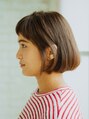 少し前下がりで丸いシルエットのアゴ下ボブ。毛先に重さを残してカットしているのでバングは短めで束感を出して重たくなりすぎないようにバランスを取っています。カラーリングは赤みのないナチュラルなブラウンカラー。