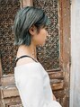 切りっぱなしのショートスタイル!寒色系のハイトーンカラーでスタイリッシュなデザインです。襟足の外ハネが今っぽいデザインになっています。前髪は分けるとクールに、下ろすと可愛らしさの出るスタイルになります!