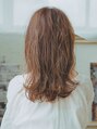 柔らかいオレンジベージュの春カラーがかわいいスタイル!ふんわりとした束感のあるシースルーバングが顔まわりを明るく見せてくれます。また明るい暖色系カラーと表面にコテ動きを出すことで重たさを消してくれます。