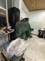 ハイライトをベースに、透明感のあるグリーンの塩基性カラーをオン。ゆるめのパーマで動きを出し、光に当たるたびに色の濃淡が際立つデザイン。個性はありつつ、抜け感も楽しめるおしゃれスタイル。