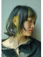 カットはボブスタイルとレイヤーをミックスしたレイヤーボブ。顔周りにはパツっとしたざく切りレイヤーに切るのがポイント。髪色は顔周りはケアブリーチ後ライムグリーン、全体はブルーブラックでコントラストを[薬院/警固][インナーカラー][ショートヘア]
