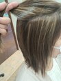 白髪をぼかす細めのハイライトを顔回りを中心に入れています。白髪染めをするほど白髪はないけど気になると言う方におすすめです。カットは軽さのある前下がりボブてす。