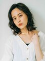無造作なミディアムレングスのウェーブヘアです。バングなしの髪型で暗めのトーンのスタイルなのでクールなイメージになります。