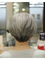 ショートカットがとてもよく似合われる、グレイヘアのお客様。ショートカットでも季節ごとにほんのり変えます。秋から冬にかけては、防寒着で首周りがもたつくことが多いので、スッキリ目にカットしています。
