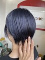 濃いめのネイビーが可愛いショートスタイル☆透明感のあるダークトーンにするために一度ケアブリーチ♪その後濃いめのネイビーでしっかりトーンダウン☆襟足スッキリのショートスタイルに大人っぽいネイビーカラーがちょっぴりギャップで可愛いスタイルです☆
