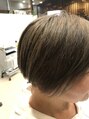 6ミリの刈り上げと左だけツーブロック。アシメに切り、バックはあまり刈り上げずにショートボブっぽくカットしました。全体ブリーチして暗めのアッシュベージュ。