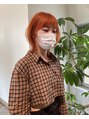 クリアオレンジのウルフヘア。トリートメントを内部にしっかり入れることで手触りのが良く、ツヤ感のあるカラーが持続します。ブリーチの回数を重ねることでより透明感が増します。ブリーチカラー/ダブルカラー/髪質改善/縮毛矯正/インナーカラー]