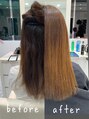 縮毛矯正のBeforeAfterです。過去に縮毛矯正したけど癖が戻ってしまった状態。もう一度縮毛するのを断られてしまうこともあったそうですが綺麗に戻しました。もちろんブロー無しでこの状態です。※色が明るくなっているのは元々表面が明るかったため。