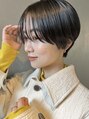 前髪からサイドにかけラインが出るようにカット。オイルでウェット感のある丸みショートに。 黒髪 ワイドバング ハンサムショート ウェットスタイル コンパクトショート ショートボブ 丸みショート 抜け感 透けバング くびれショート