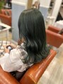 秋、冬トレンドのグリーン系!暗すぎず落ち着いたモーブグリーン。パキッとした色味がかわいいです♪ブリーチ/ダブルカラー/インナーカラー/デザインカラー/ブリーチなしダブルカラー/ハイトーン/髪質改善/縮毛矯正/酸性ストレート