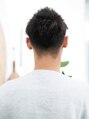 サイド、えりあしは短めに刈り上げ。トップは少し残してカットしました。サイドは浮きやすいのでワックスで潰すようにおさえます。