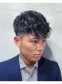 スペインカール。刈り上げは4mm。前下がりでバングはパーマをかけて目にかからないくらい。サイドも前に流れるようにかけています。とってもかっこいい。