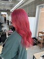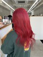 ブリーチ2回~ ほんのりピンクをいれたレッド系カラー^^ 黒染めをしておられたので、限界はありますができるだけブリーチで抜いています^^ カラーバターを混ぜてます!福岡/天神/エクステ/シールエクステ/ボブ/縮毛矯正/髪質改善/カラー/ブリーチ/今泉