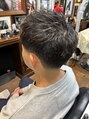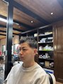 低めの刈り上げ(ネープ、もみあげ)にフェードが入ってます。部分的にフェードを入れるスタイルをエリアフェードと言います。トップは細かく隙間を入れ立ち上がり、エアリー感を出してます。