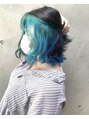 ブリーチ回数1回~。(フロントからバックにかけてのインナー部分にのみ使用)色落ちでコケっぽくならないようにターコイズグリーンで色味を調整していきました◎黒髪との相性もばつぐんです♪